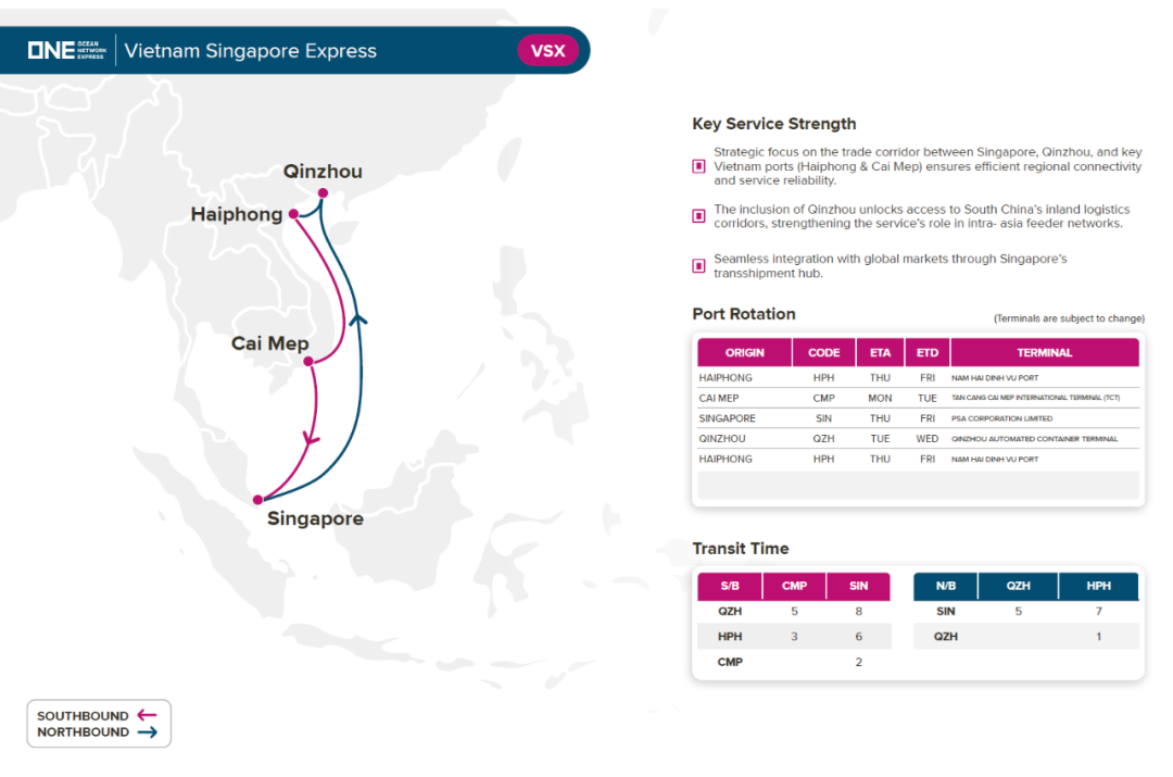 ONE VSX快航新增挂靠钦州港,一方面强化经新加坡与中国内陆的链接,另一方面开辟钦州与越南之间的直航新通道。